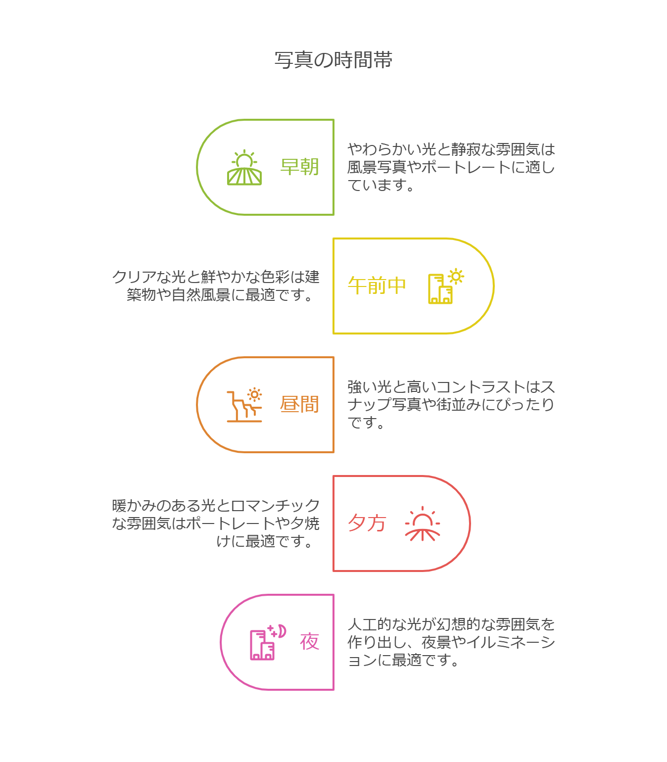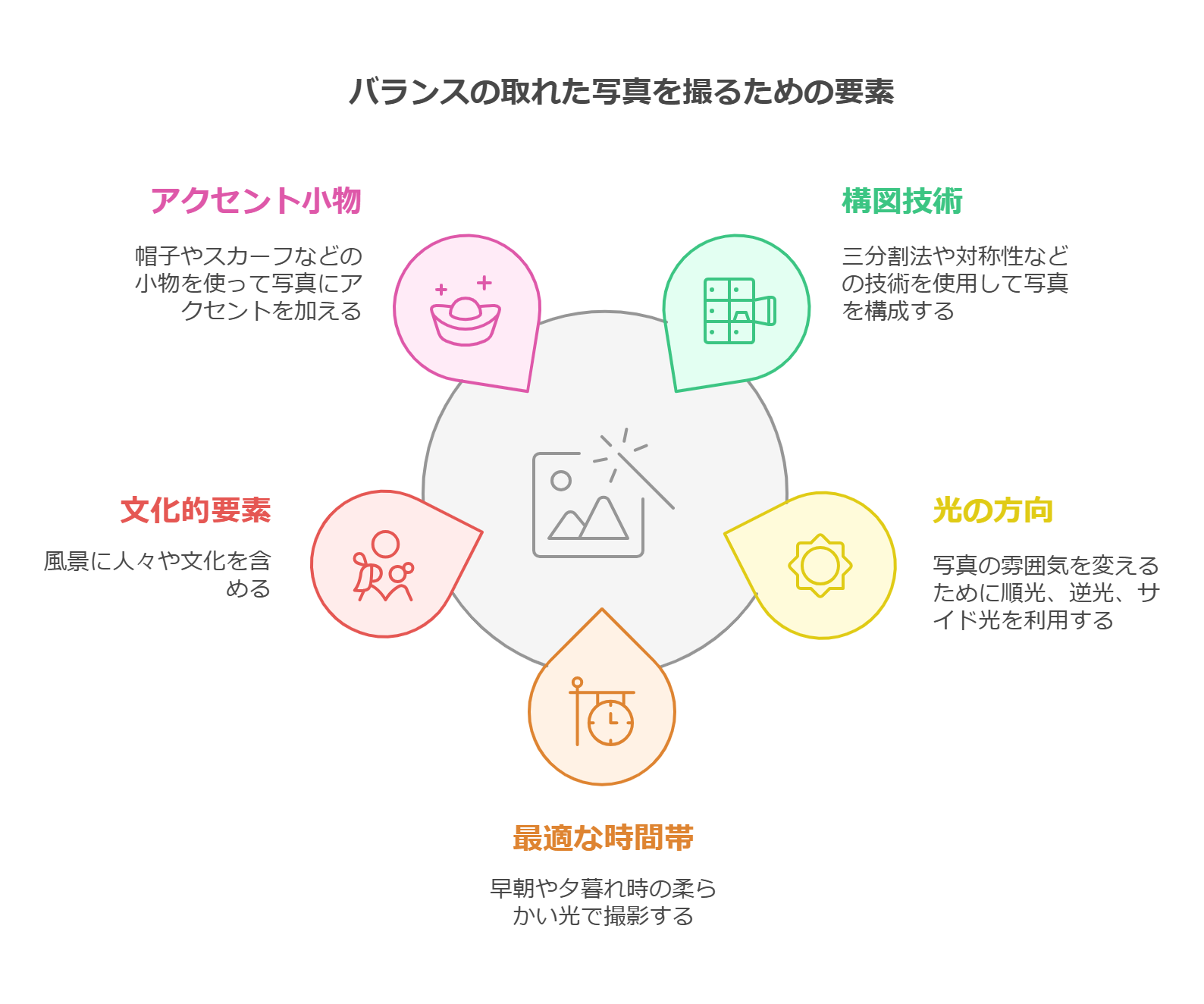 時間帯によって光の質や色が変化するため、撮影する時間帯を意識することで、より印象的な写真に仕上がります。