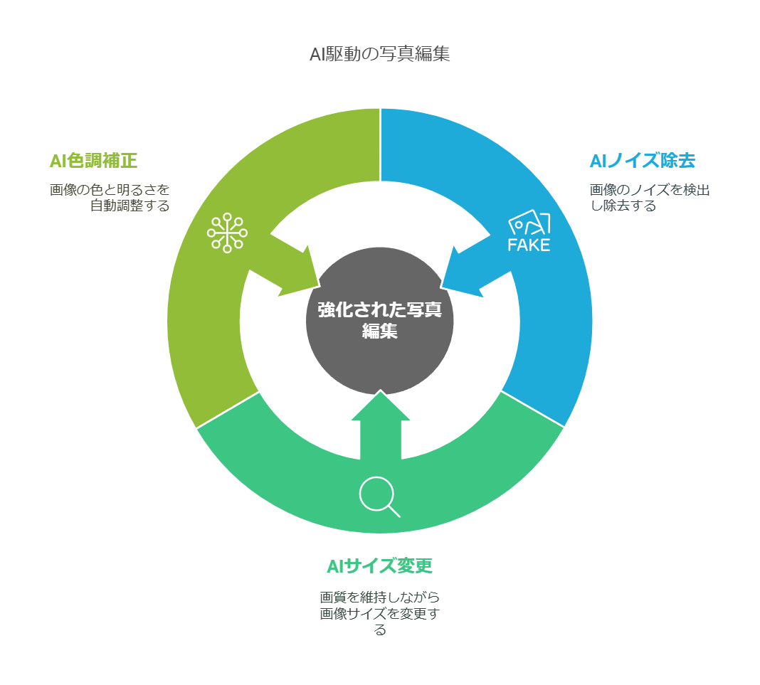 AIは写真編集の分野にも大きな影響を与えています。従来、高度な写真編集には専門的な知識と技術が必要でしたが、AIを活用した編集ソフトの登場により、初心者でも簡単に高品質な画像編集が可能になりました。例えば、AIによるノイズ除去機能は、画像のノイズを自動で検出し、除去することで、よりクリアで美しい画像を実現します。また、AIによる画像の拡大・縮小機能は、画質の劣化を抑えながら、画像サイズを自由に変更することを可能にします。さらに、AIを活用した自動色調補正機能は、画像の色味や明るさを自動で調整し、より自然で印象的な写真に仕上げます。