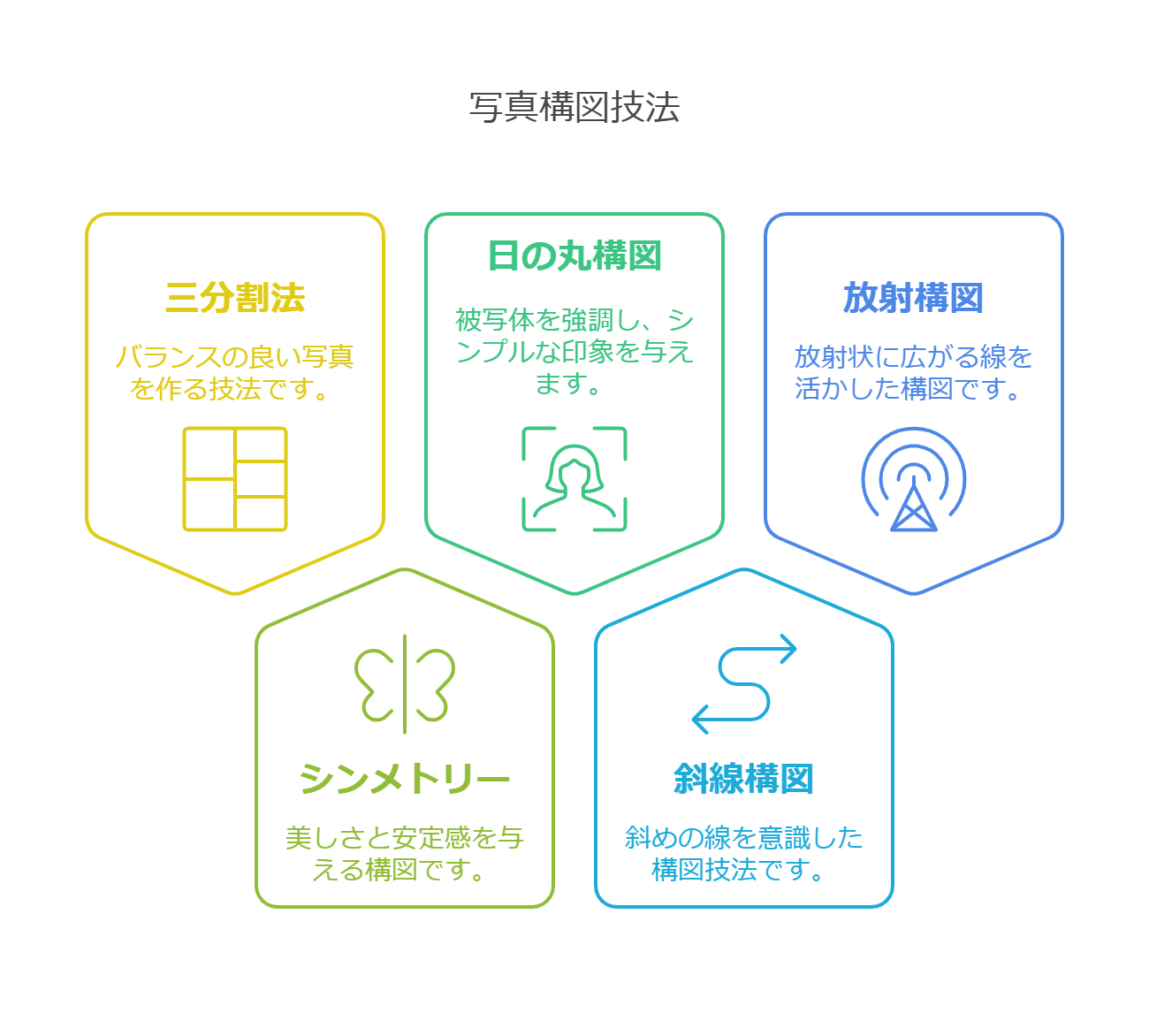 その他にも、斜めの線を意識した斜線構図や、放射状に広がる線を活かした放射構図など、様々な構図があります。色々な構図を試して、自分の表現したいイメージに合う構図を見つけましょう。