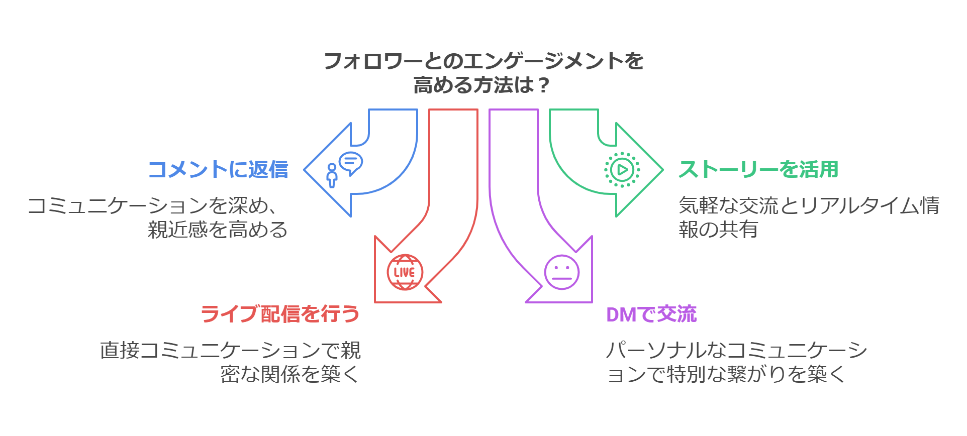 エンゲージメントを高めるためには、ユーザーとのインタラクションを積極的に行うことが重要です。以下の工夫を取り入れて、フォロワーとの繋がりを深めましょう。