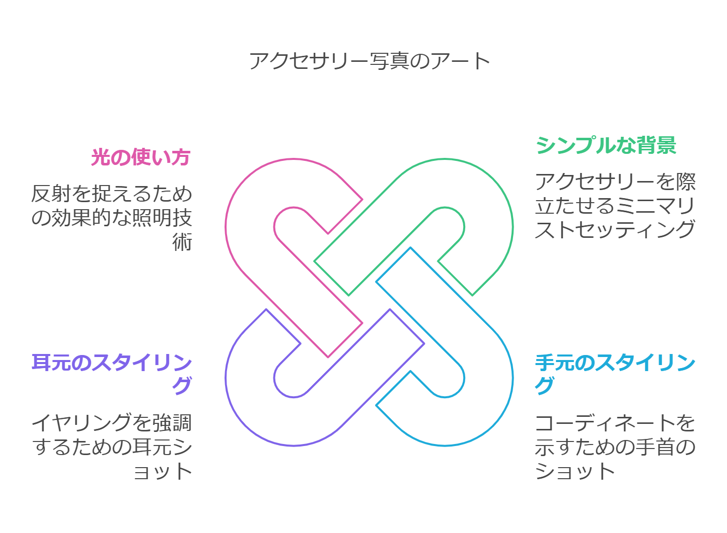 お気に入りのアクセサリーを主役にした写真も人気です。シンプルな背景にアクセサリーを配置することで、その美しさが際立ちます。また、手元や耳元にアクセサリーをつけた写真も、コーディネートの参考として役立ちます。光を効果的に使って、アクセサリーの輝きを捉えましょう。