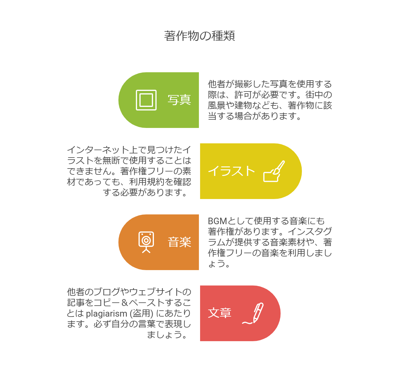 他者の著作物を無断で使用することは著作権侵害にあたります。著作物には、写真、イラスト、音楽、文章など様々なものが含まれます。たとえインスタグラム上で見つけた画像であっても、無断で使用することはできません。必ず権利者の許可を得て、適切なクレジット表記を行いましょう。また、有料素材サイトで購入した画像であっても、利用規約に則って使用することが重要です。商用利用が禁止されている素材を、ビジネスアカウントで使用することはできません。