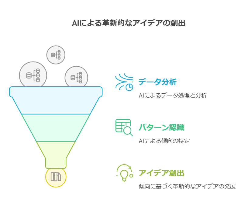 AIツールは、大量のデータを分析し、人間では気づきにくいパターンや相関関係を発見することができます。これを活用することで、新しい製品やサービスの開発、既存ビジネスの改善など、革新的なアイデアを生み出すことができます。