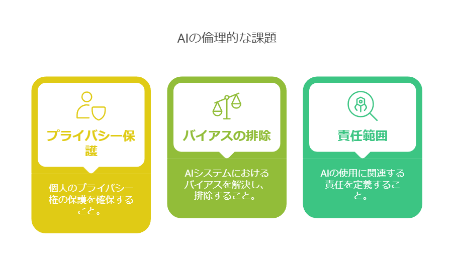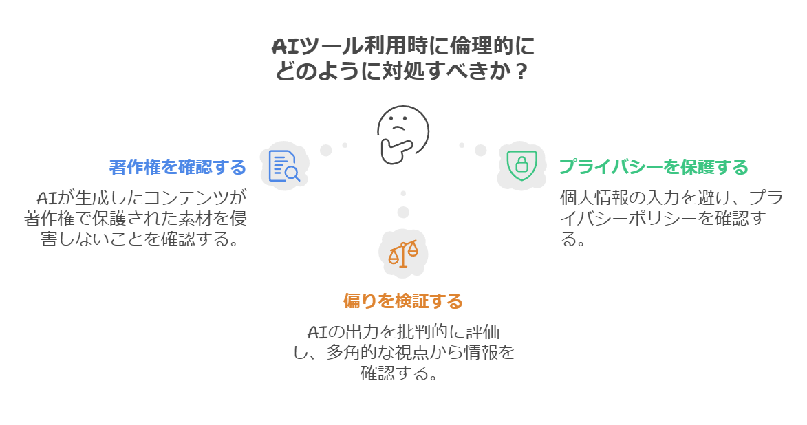AIツールを利用する上で、倫理的な問題を無視することはできません。特に、著作権やプライバシーに関する問題には十分な配慮が必要です。