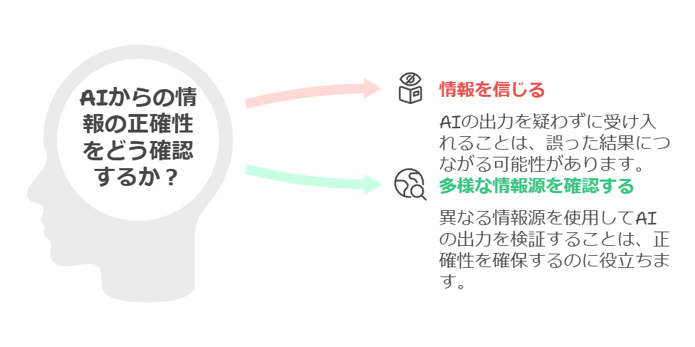 AIツールは常に正しい情報を提供するとは限りません。出力された情報は必ずしも正確ではないことを理解し、裏付けを取ることが重要です。