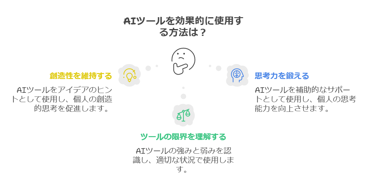 AIツールはあくまで補助的なツールです。AIツールに過度に依存すると、自身の思考力や創造力が低下する可能性があります。
