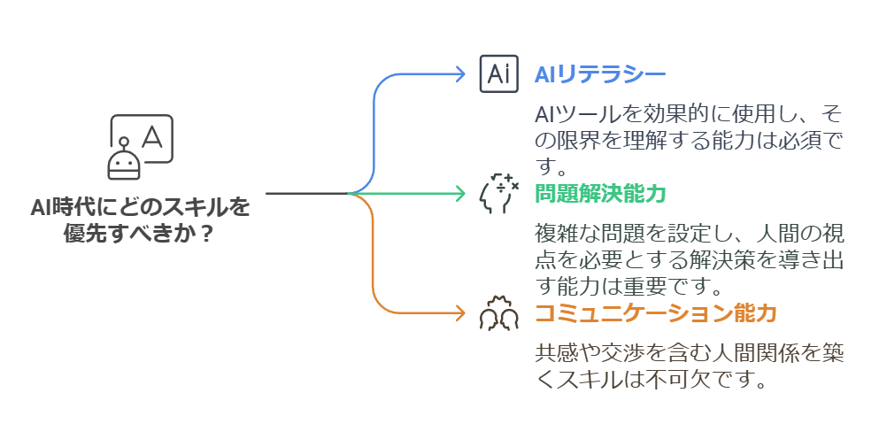 AI時代を生き抜くためには、AIを使いこなすスキルだけでなく、AIでは代替できない人間ならではのスキルを磨くことが重要です。