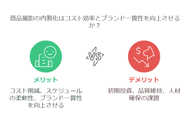 商品画像撮影を内製化することで、様々なメリットがある一方で、デメリットも存在します。自社に適した方法を選択するために、両者をしっかりと比較検討することが重要です。