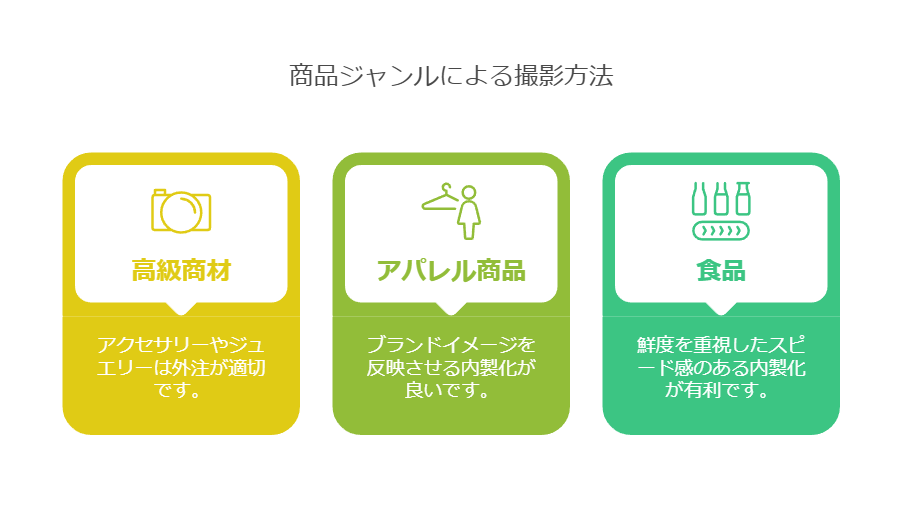 商品ジャンルによって、適切な撮影方法が変わります。例えば、アクセサリーやジュエリーなどの高級商材は、質感を精緻に表現する必要があるため、専門的な技術と機材を持つ業者に外注するのが適しています。一方、アパレル商品のように、商品の雰囲気や着用イメージを伝えることが重要な商材は、自社のブランドイメージを反映させやすい内製化も選択肢となります。また、食品のように鮮度が重要な商材は、スピード感を持って撮影できる内製化が有利です。