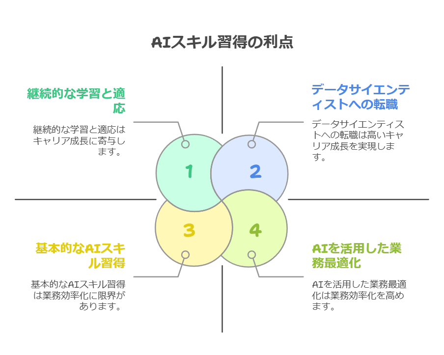 AIスキルを身につけることで、様々なメリットがあります。まず、キャリアアップのチャンスが広がります。AI関連の職種は需要が高く、高収入が見込める職種も多いです。データサイエンティスト、AIエンジニア、機械学習エンジニアなどは、特に注目を集めています。また、既存の業務を効率化できるというメリットもあります。例えば、営業担当者がAIを活用して顧客へのアプローチを最適化したり、マーケティング担当者がAIを活用して広告効果を最大化することができます。さらに、新しいビジネスやサービスを創造できる可能性も広がります。AIを活用した新しい製品やサービスを開発することで、市場で競争優位性を築くことができます。