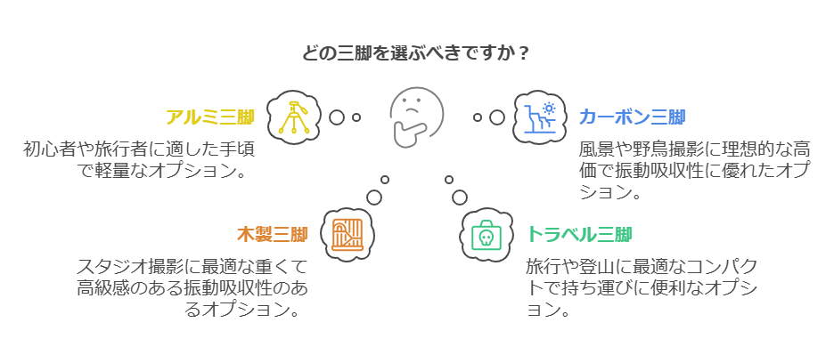 三脚は、素材、構造、機能など、様々な観点から分類できます。主な種類と特徴は以下の通りです。