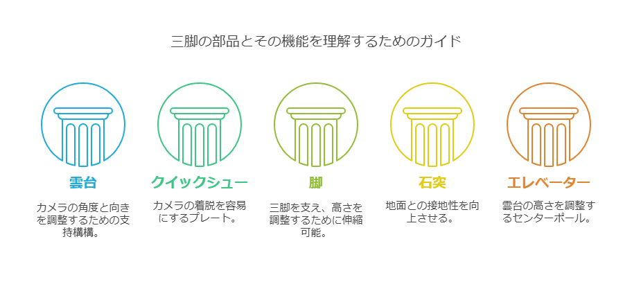 三脚は様々な部品で構成されています。それぞれの名称を理解することで、より効果的に三脚を使用することができます。