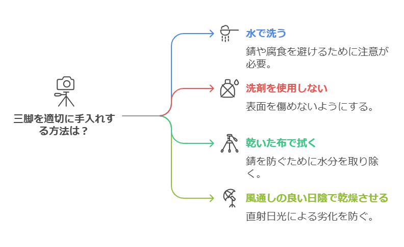 砂が大量に付着している場合や、泥が付いている場合は、水洗いが必要になることもあります。ただし、水洗いは三脚の錆や腐食の原因となるため、注意が必要です。水洗いをする場合は、真水を使用し、洗剤は使用しないようにしましょう。また、水洗いの後は、必ず乾いた布で水分を拭き取り、風通しの良い日陰で完全に乾燥させることが重要です。乾燥が不十分だと、錆が発生する可能性があります。海水で濡れた場合は、真水で洗い流すことで塩分による腐食を防ぎます。以下の表に水洗い時の注意点と対応策をまとめました。