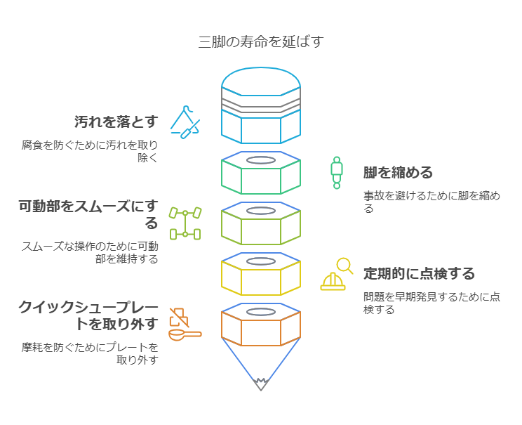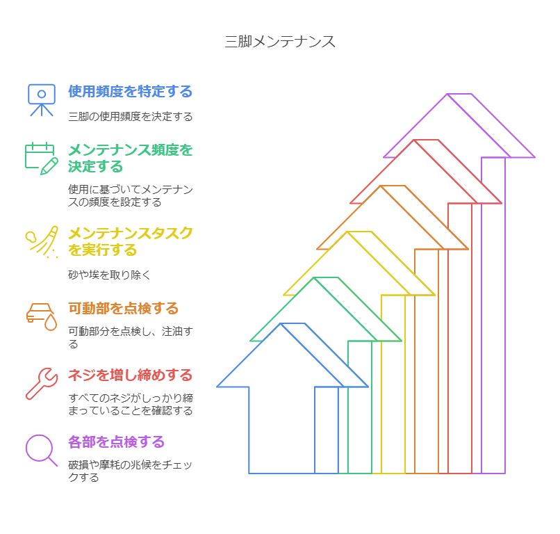 逆に、使用頻度が低い場合は、毎回使用後の簡単な清掃に加え、数ヶ月に一度、念入りなメンテナンスを行うようにしましょう。長期間使用していない三脚は、使用前に必ず各部の動作確認を行い、必要に応じてメンテナンスを行いましょう。