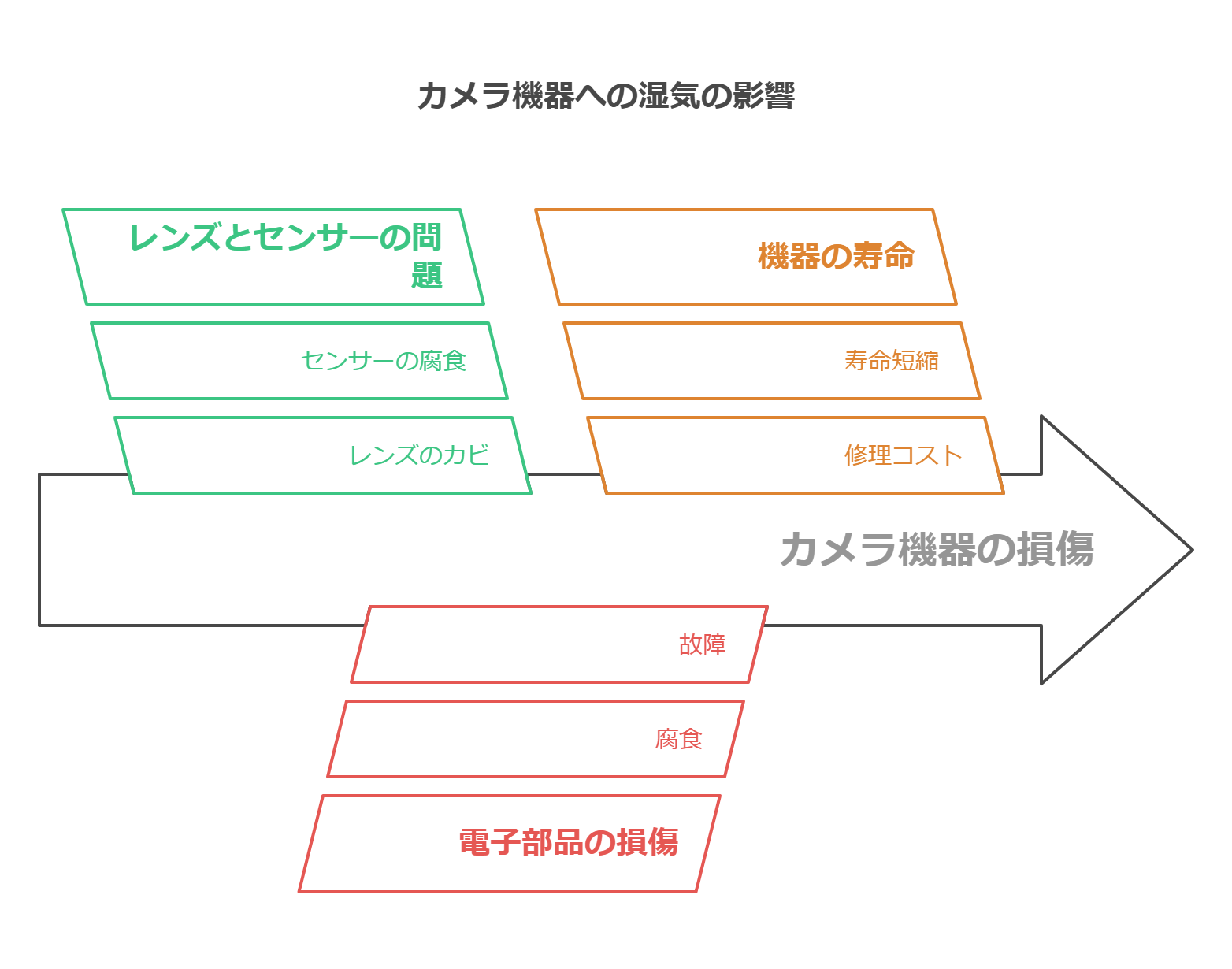湿気はカメラの大敵です。カメラ内部に湿気が侵入すると、レンズやセンサーにカビが発生し、深刻な故障の原因となります。カビは一度発生すると除去が難しく、修理費用も高額になる場合が多いです。また、電子部品の腐食も引き起こし、カメラの寿命を縮める原因となります。特に梅雨時期や高温多湿の環境では、適切な湿気対策が必須です。