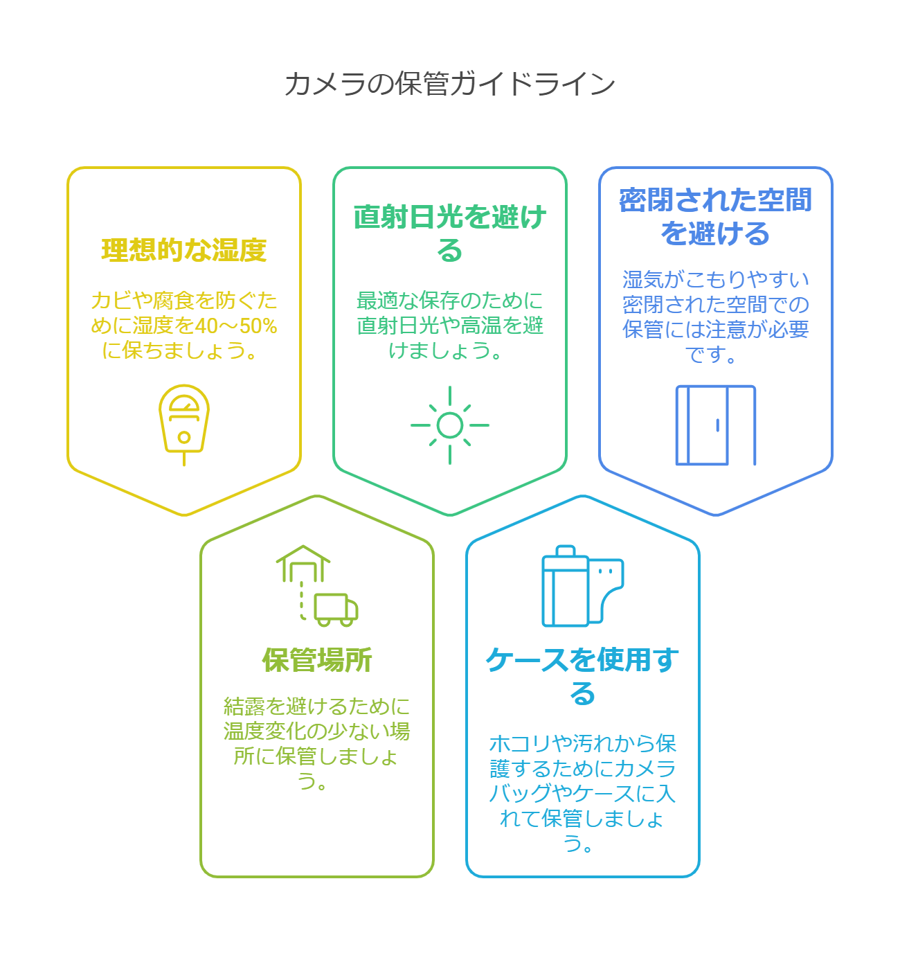 以下の3原則を心がけることで、カメラを良好な状態で長く使い続けることができます。