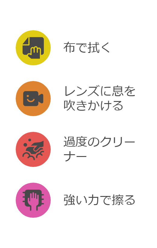 | クリーニング液 | レンズの油脂汚れを落とす | レンズに直接吹きかけない |