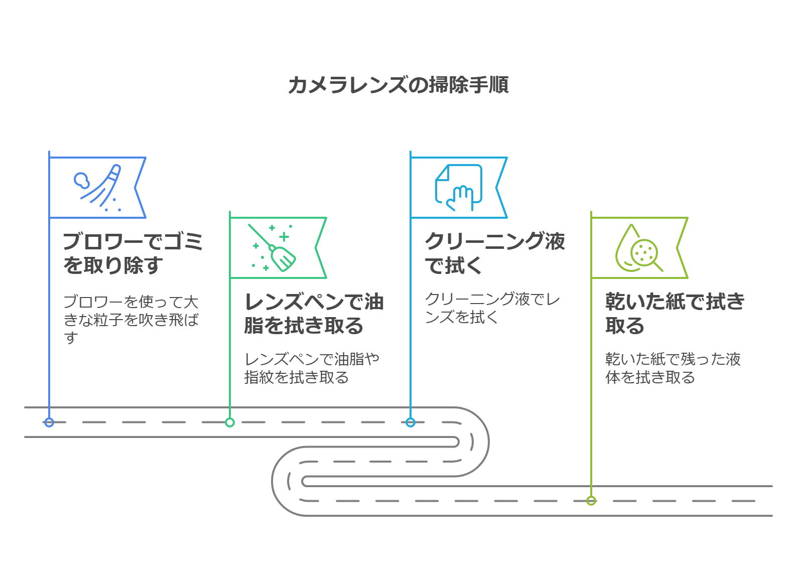 | クリーニングペーパー | クリーニング液を塗布してレンズを拭く | 一度使用したペーパーは再利用しない |